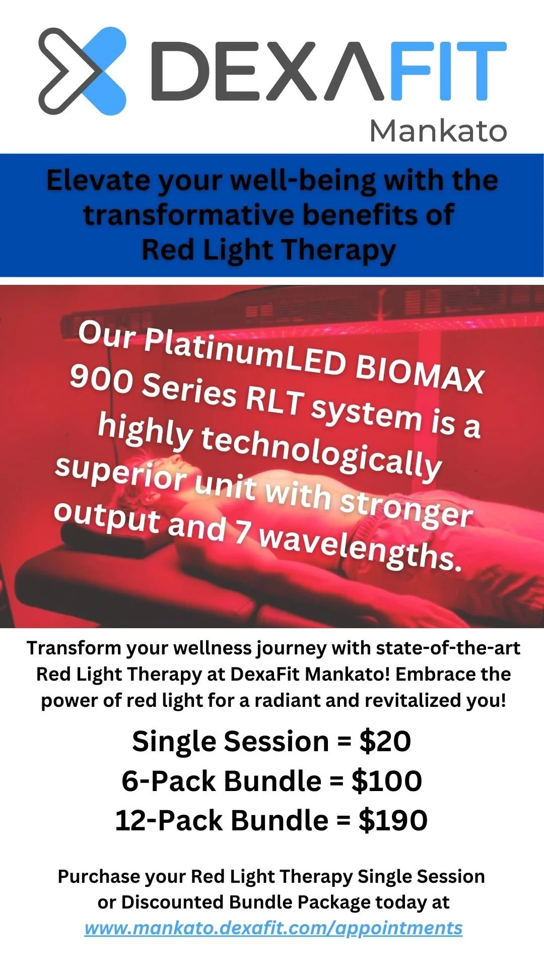 Transform your wellness journey with state-of-the-art Red Light Therapy at DexaFit Mankato! Illuminate your path to vitality with this non-invasive, cutting-edge technology that promotes cellular rejuvenation, collagen production, and overall skin & joint health. Embrace the power of red light for a radiant and revitalized you!